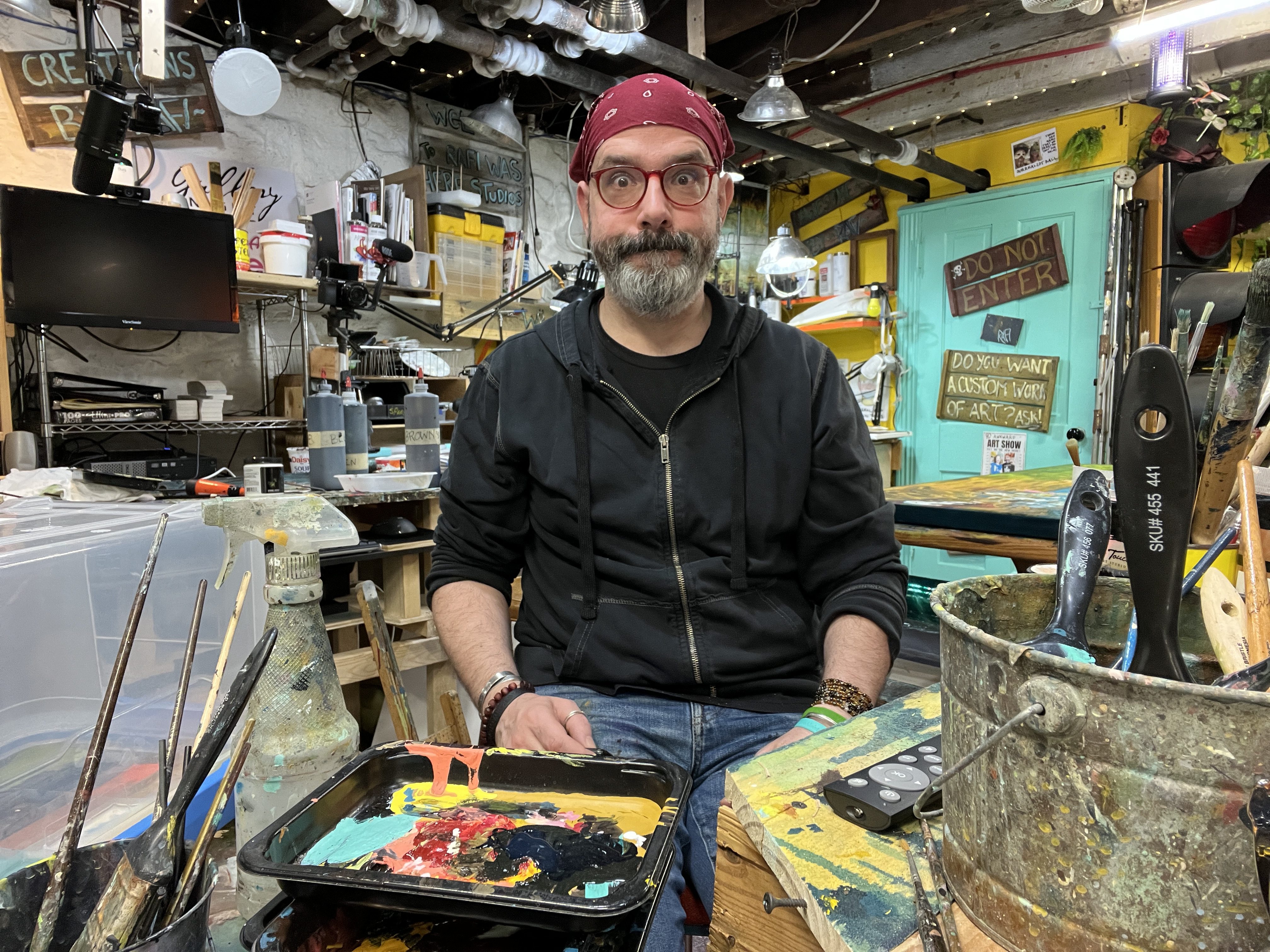 An artist in a studio examining colorful paintings on a table, surrounded by art supplies and decorations.