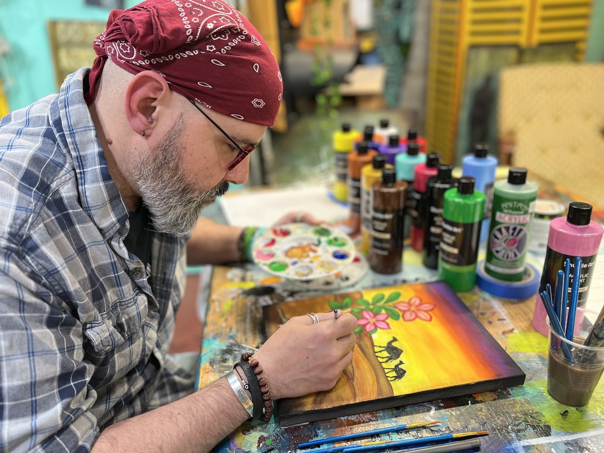 Somewhere between me waving my brush in the air like a paint wizard, running around the room helping people with desert roses and camel silhouettes, and laughing at my own bad jokes, the whole thing just flowed. (Yes, I was totally giving “art teacher who means business” vibes.)